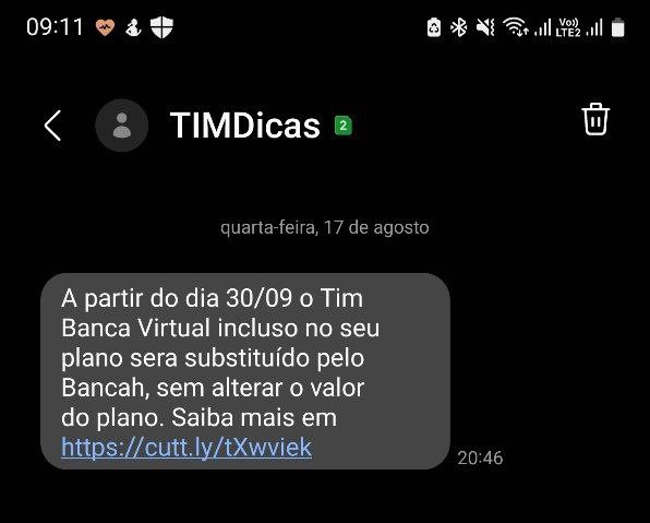 Em uma mensagem de SMS enviada pela companhia, a TIM comunica sobre a substituição, afirmando que a troca não afetará o valor dos planos de internet móvel, passando a valer a partir de outubro deste ano, mas sem informar o dia. O texto também traz um link que direciona para a página do Bancah .